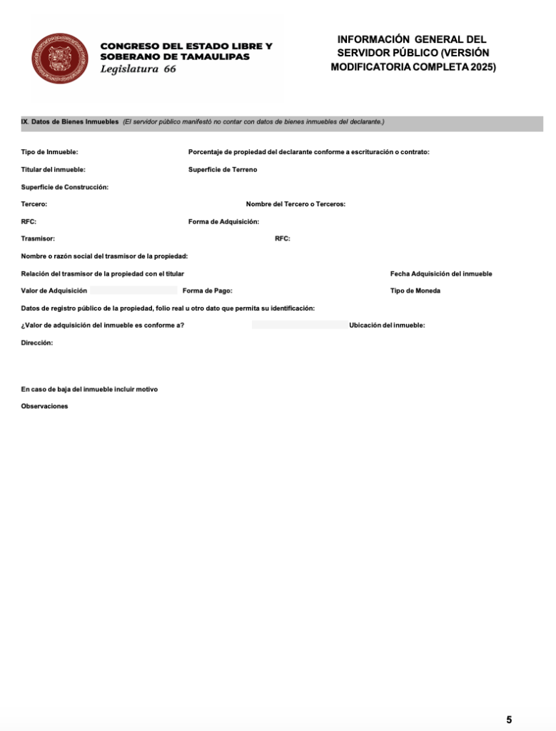 Una revisión de registros inmobiliarios en los condados de Hidalgo y Cameron, Texas, revela que diputados de la 66 Legislatura de Tamaulipas —del PAN, Morena y Movimiento Ciudadano— omitieron reportar propiedades en el extranjero dentro de sus declaraciones patrimoniales. Pese a que la Ley de Responsabilidades Administrativas los obliga a transparentar su situación económica real, los legisladores optaron por clasificar sus declaraciones como no públicas, obligando a un rastreo documental en archivos fiscales de Estados Unidos que confirma la existencia de bienes inmuebles a su nombre que no figuran en sus registros oficiales en México.