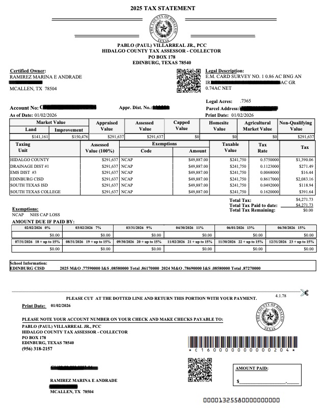 Una situación similar se documenta con la diputada panista Marina Edith Ramírez Andrade, quien sostuvo en entrevista no tener bienes en el país vecino. Sin embargo, los estados de cuenta de propiedad del Condado de Hidalgo la mantienen como titular de un predio de 3,480 metros cuadrados en McAllen e incluso registran una transacción con el municipio para la cesión de derecho de vía.